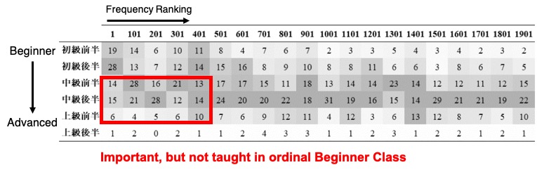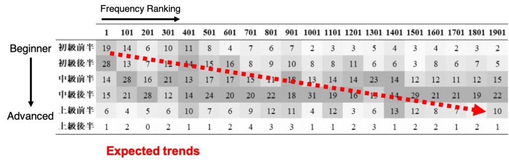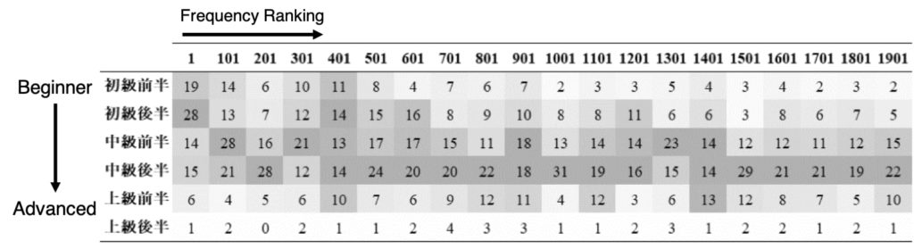 初級前半から中級後半にむけて頻度が増え、上級になると登場する語が少なくなる。