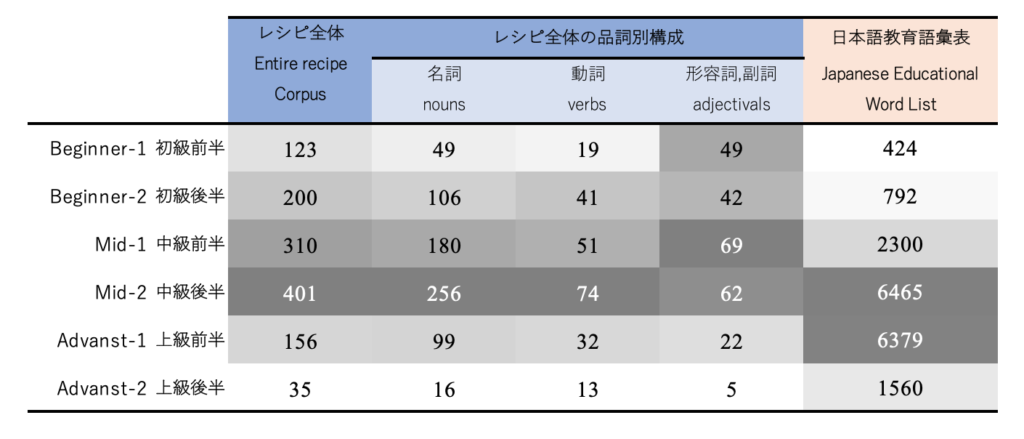 Table 3. Comparing the structure of the Recipe Corpus and Japanese Educational Word List(JEWL).