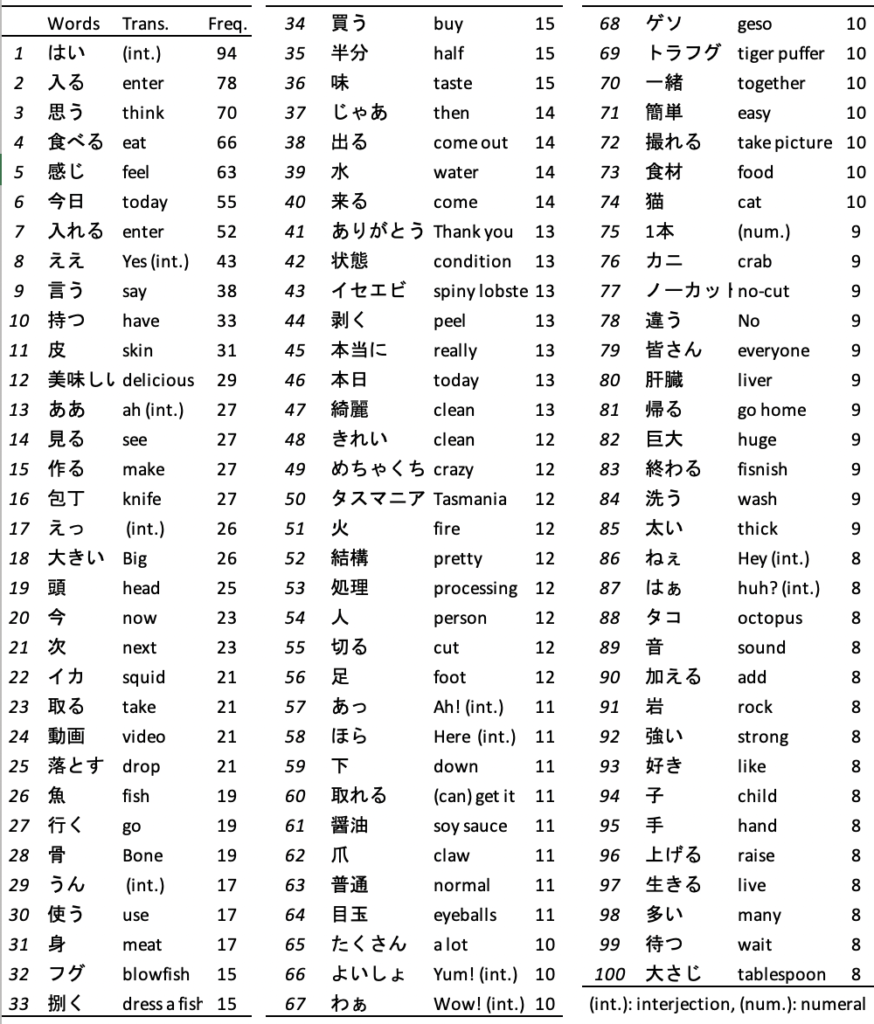 The main collocations for ‘捌く[3rd] /sabaku/ dress or process (a fish)’ were ‘思う think’ and ‘魚 fish’.