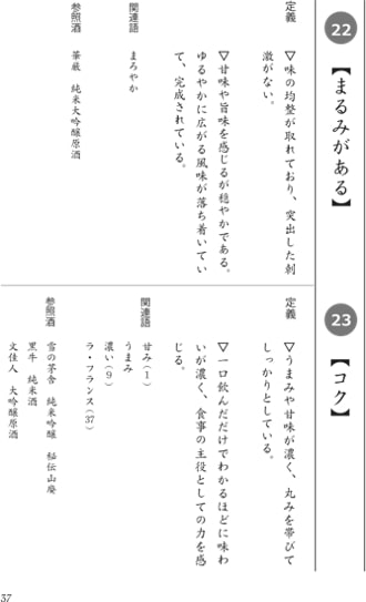 見出し語に加え,類語や対義語に相当する語を「関連語」として紹介し,見出し語の味わいが感じられる日本酒を「参照酒」として掲載する.身体知の学びに重要と思われる「用例」という項目を備える見出し語もある.