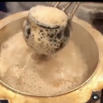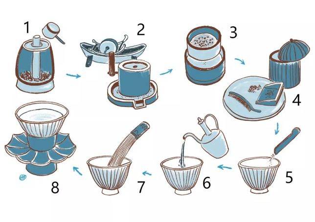 ⑤ Dividing the tea. Remove the layer of water on the froth that looks like black mica, otherwise the tea broth will not taste pure. The water from the first bowl is called “Chunyong”, which can be drunk directly and has a good taste, and can also be used to stop the boiling process.