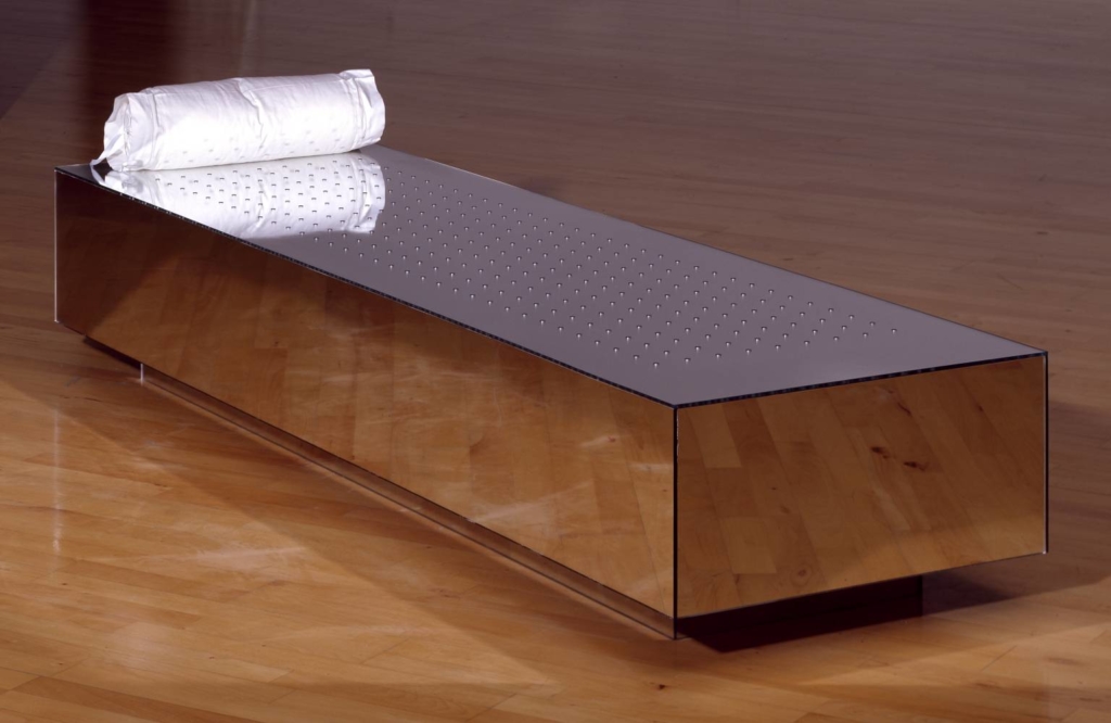 Valeska Soares’s Fainting Couch, with its geometric shape and highly reflective surface, seems at first to recall 1960s minimalism, in particular works by Robert Morris (born 1931) such as the mirrored cubes of Untitled 1965/71 (Tate T01535). Approaching the work, a grid of evenly spaced holes drilled in the surface of the object becomes apparent, as does a heady aroma that pervades the air around the work. The perfume is that of the Stargazer lily, a highly scented flower. Bunches of these lilies are concealed in drawers inside the couch and replenished as needed while the object is on display.