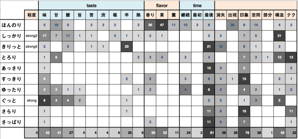 この研究は科研費課題として進行中ですが,パイロット研究の結果として,日本酒の味に関して下のマトリックスに表されるような,味と形の対応関係が示されました.