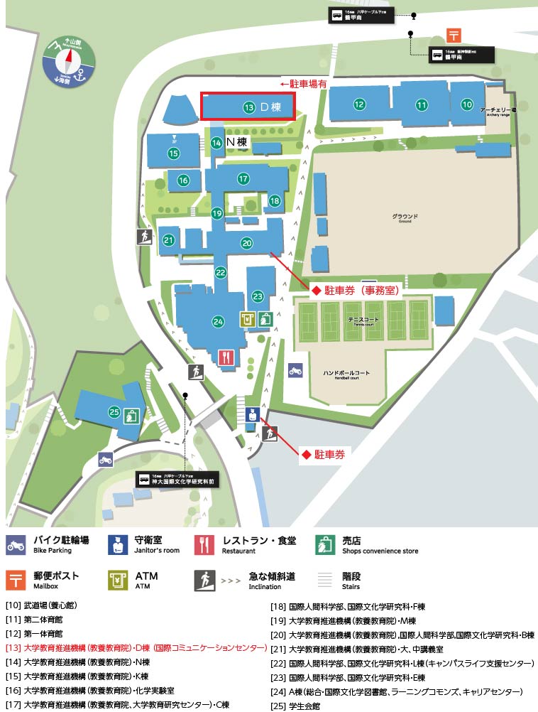 地図中では13番の建物がD棟です。